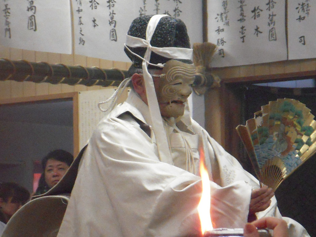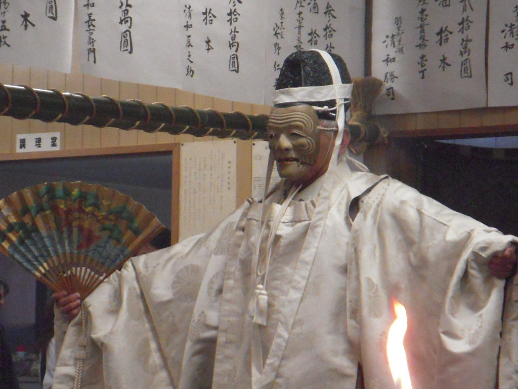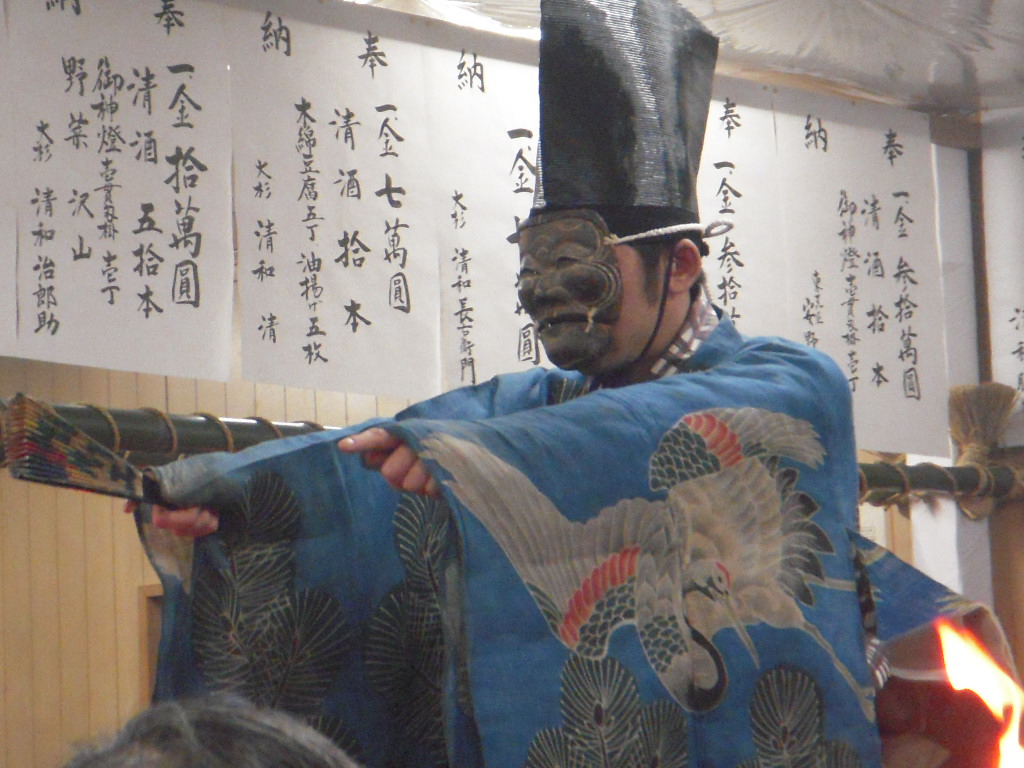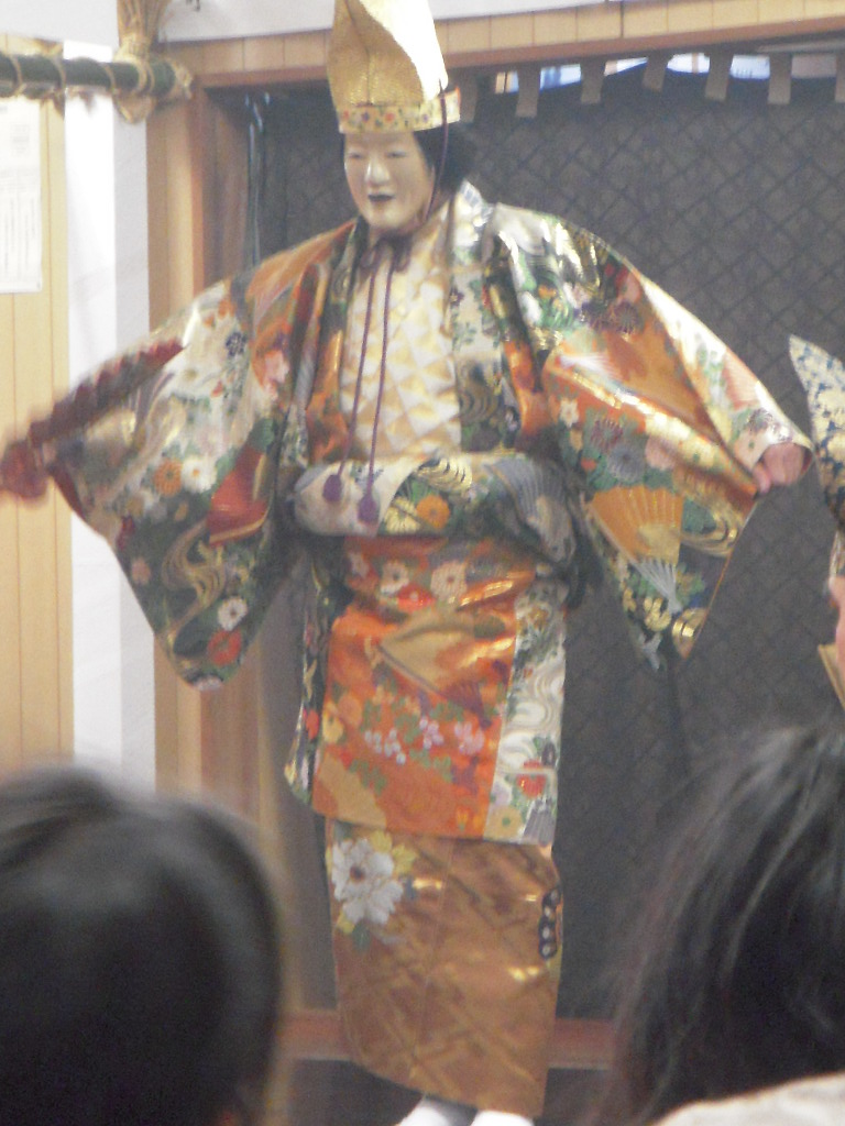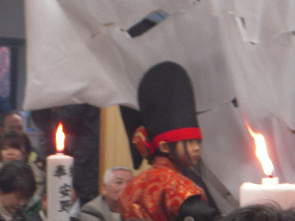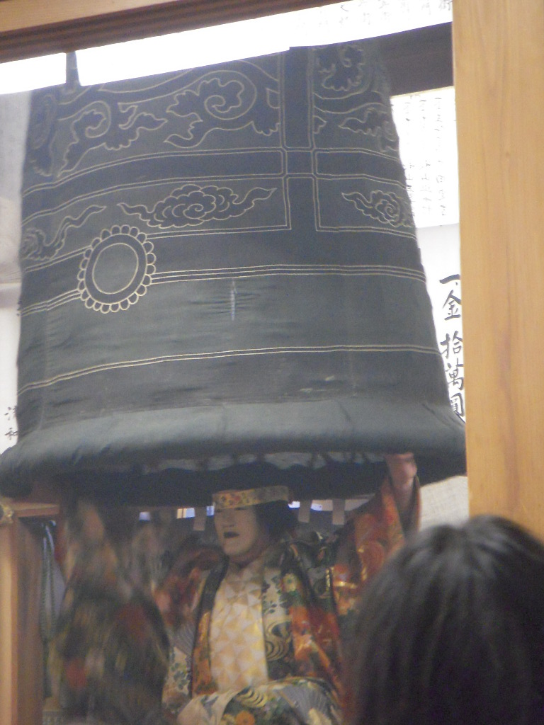 女装した4歳の男児が衣を広げられた王祇様(ご神体)の前で元気に演じました。