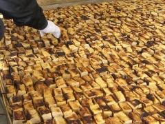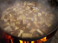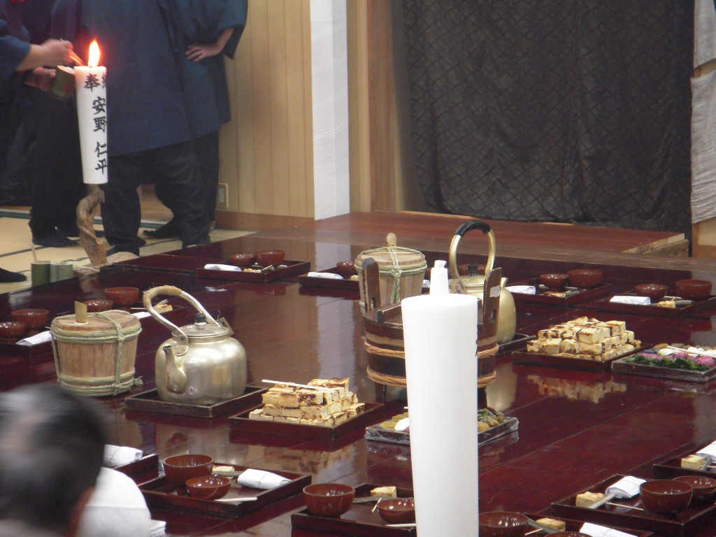 こちらでは事前の「豆腐焼き」「豆腐煮」行事でつくられた豆腐とゴボウに「二番」という熱い汁をはっていただくのが恒例です。